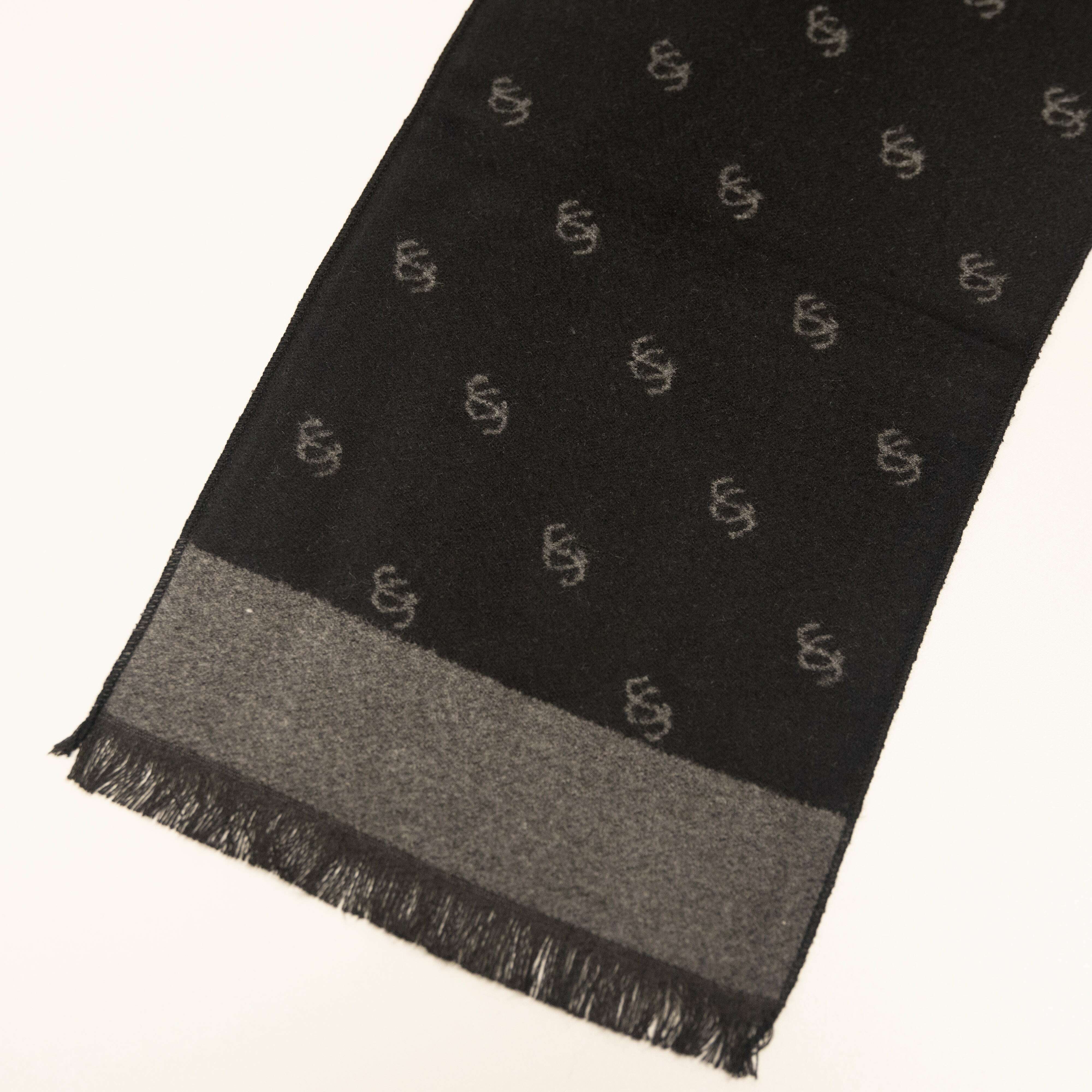 Elegante bufanda SG en color negro y gris, tejida al 100% con jacquard de algodón y decorada con logos, para agregar un toque exclusivo y sofisticado a tu atuendo.