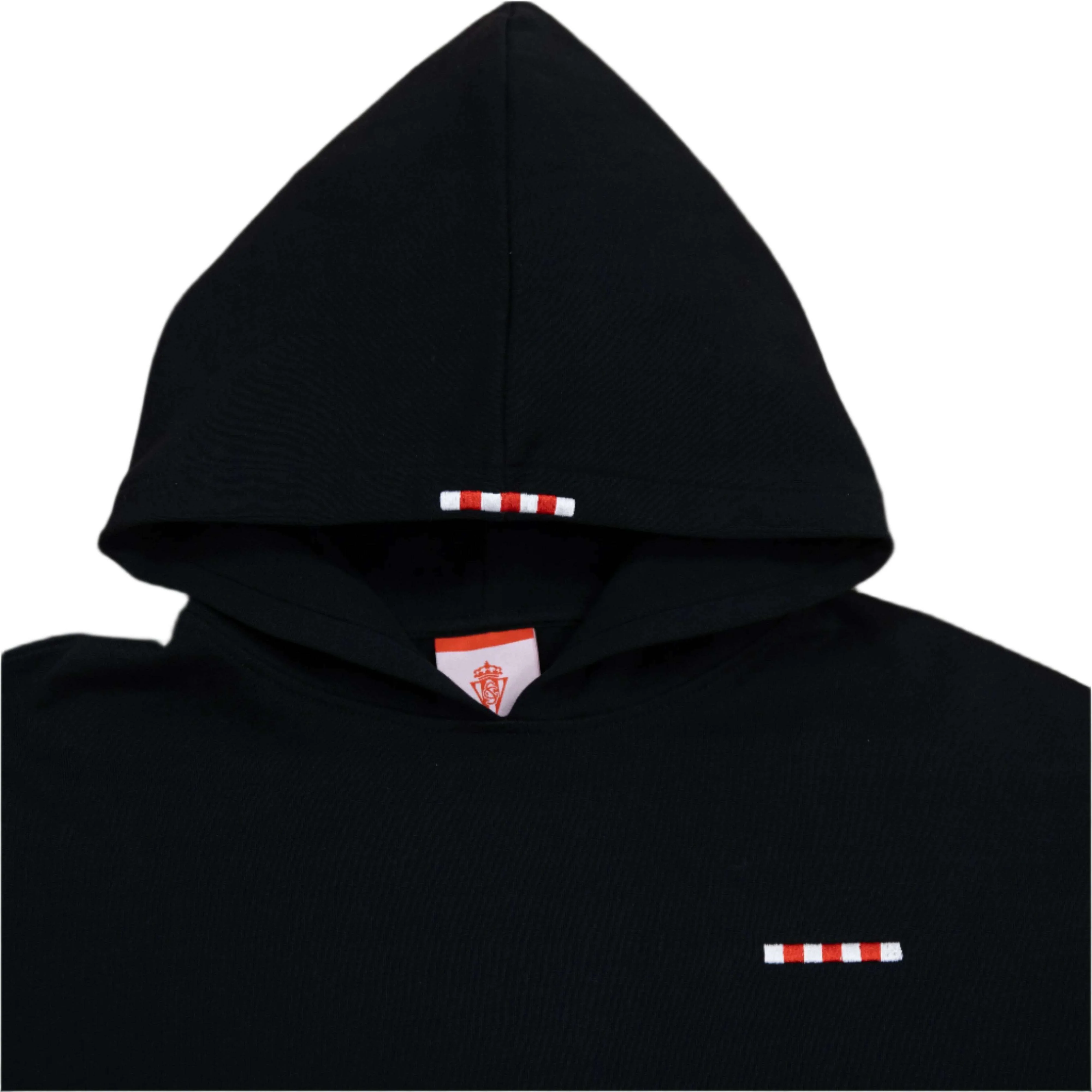 La sudadera más cool: Hoodie SG NEGRA JR. con detalles en bordado blanco y rojiblanco en la capucha. 60% algodón, 40% poliéster, 300 gr/m3.