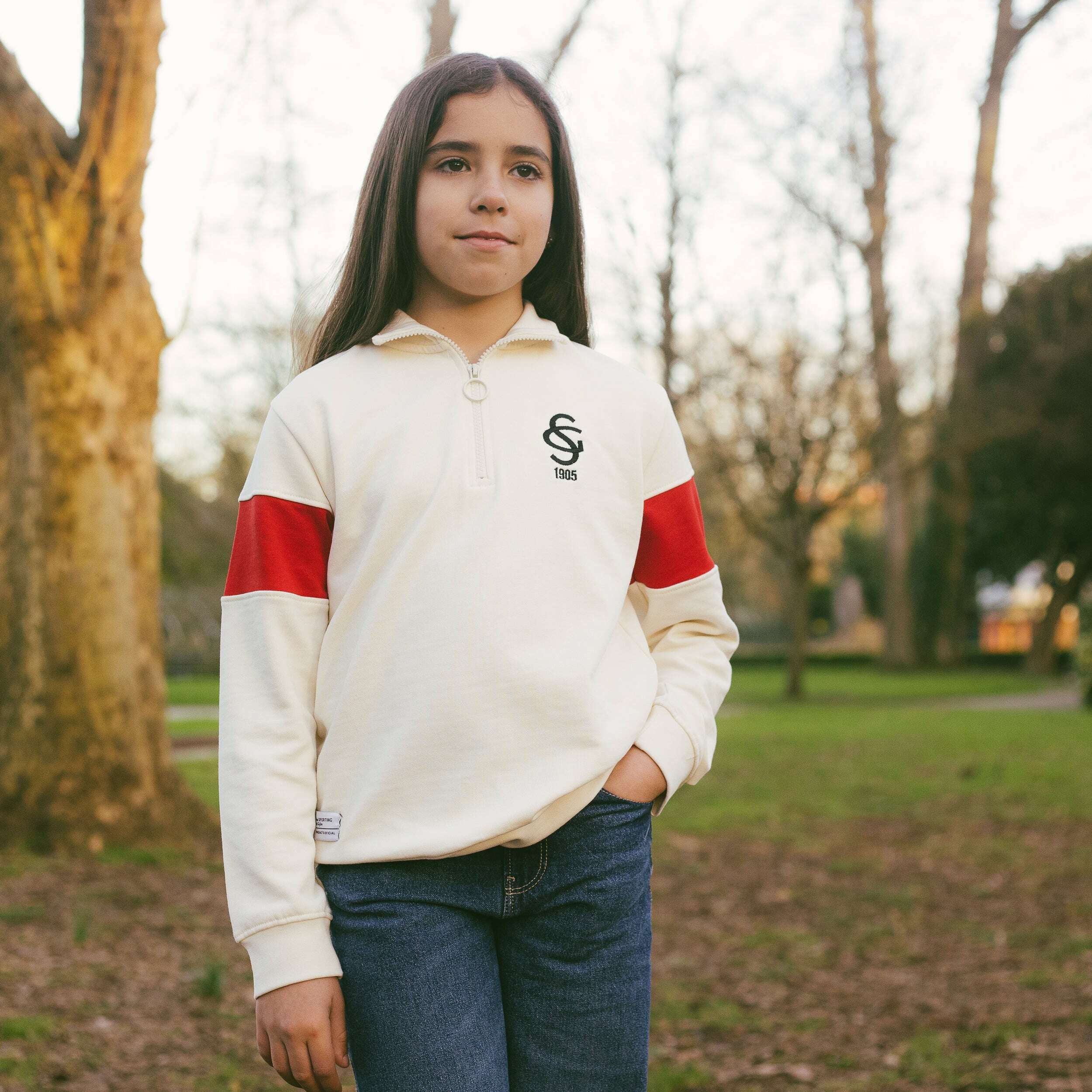 La Sudadera para niño 1/4 Zip SG JR en beige, con detalles rojos en las mangas y bordados en negro en el pecho y la espalda, ofrece estilo y comodidad. Confeccionada en 60% algodón y 40% poliéster de 300gr/m2, es una prenda resistente y duradera. Ideal para mantenerte abrigado y con estilo.